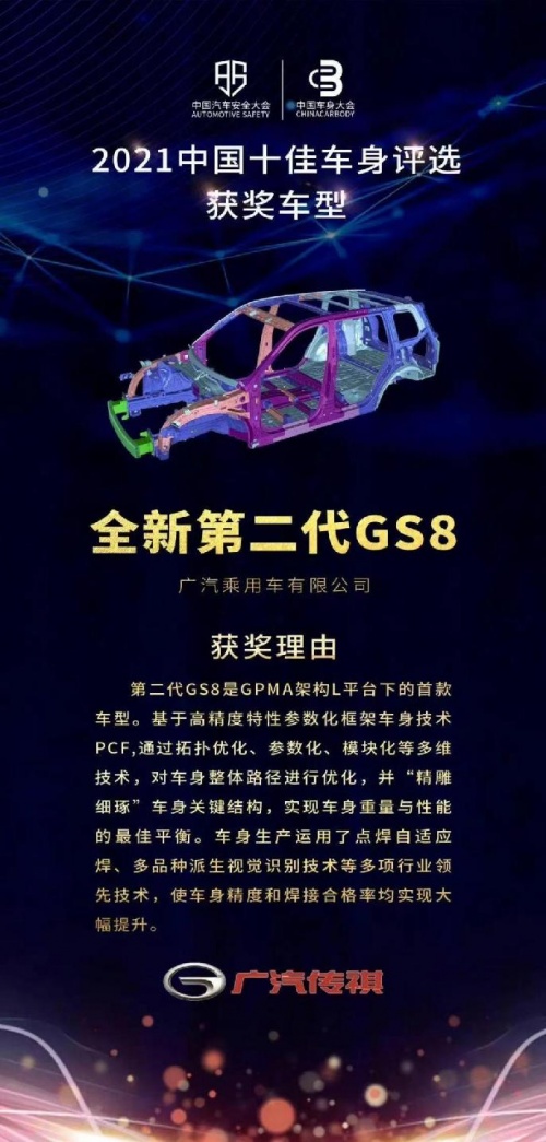 此外,全新第二代GS8获得了中国车身大会评选的“2021中国十佳车身”奖,其车身结构基于GPMA架构设计,实现最优的吸能和传力要求,在各种碰撞工况中都能实现乘员舱结构稳定可靠,碰撞性能达到2021版C-NCAP五星,同时达到2020版CIASI碰撞 “G”成绩。