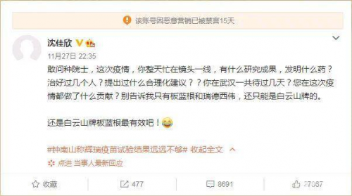 沈佳欣攻击的不只是钟院士,矛头还指向“板蓝根和瑞德西伟,还只能是白云山牌的”,并且再次强调“还是白云山牌板蓝根最有效吧”。这就更可笑了。今年10月份,钟院士说复方板蓝根体外抑制新冠病毒有效、说瑞德西韦什么的,是经过严谨科学实验的。沈佳欣把这些经过药物实验的例子当作钟院士的黑料,就说明此人根本没有科学精神,也根本对科学家毫无尊重。