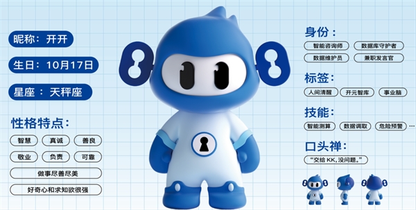 二十年的成长,二十载的革新。开元咨询实现价值提升的理念,建立了集人才资源、产业资源、信息资源等为一体的智库体系。在这个庞大的智库体系里,活跃的智慧因子,通过不断地碰撞、交汇、整合,催化出了智慧生命体Karon,昵称“开开”。“开开”生于智库,长于创新,是开元智慧的集大成者。“开开”的头上插着两把钥匙,分别是“智慧之匙”和“信念之影”,“开开”思考的时候,两把钥匙总会不受控制地微微转动。