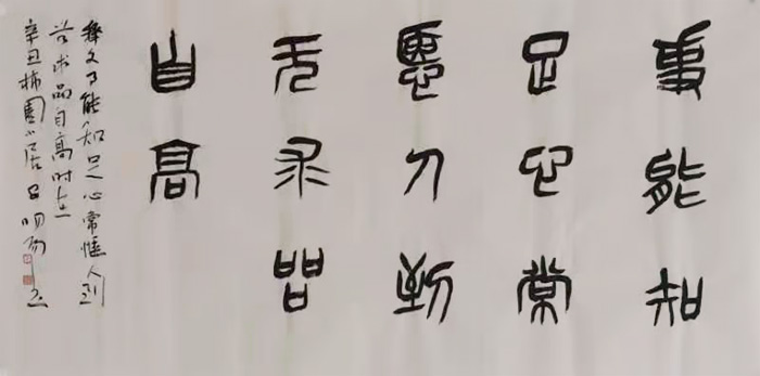 傲不可长,欲不可纵,志不可满,乐不可极。几十年来,安明阳先生就是在谦恭、平和中去书写他的书法,用他的人格魅力去感召周围的人。正因为这种品质,造就了他的篆刻和书作,既有中山王鼎的典雅飘逸、精细绮丽,又不乏古刀币的高古拙朴、浑厚粗犷。他问鼎中山数十载,今已入展全国大展多次。