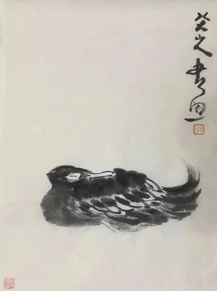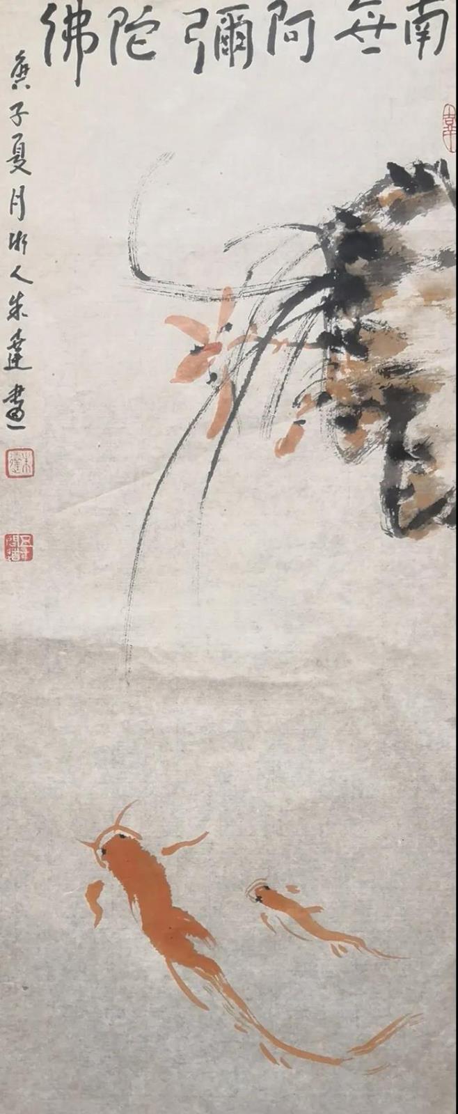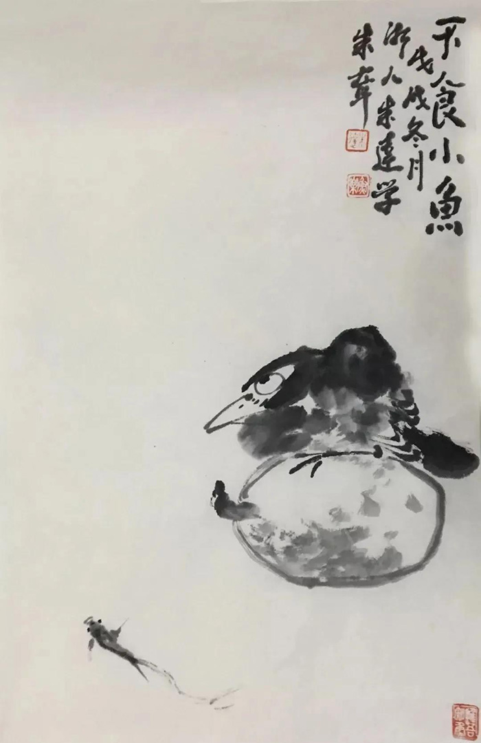 朱逹作画,专攻画鱼旁及其它。“师古而不泥古,涉新而不流俗”。在创作中,他多取法八大山人“以少胜多”的笔墨程式,极为简净的构图,极为简净的笔墨,常常通过寥寥几笔,就把物象的特点诠释出来,画面鲜活灵动,形神兼备、言简意丰。加之大面积的留白,幽淡、寂静、闲远,给作品以无限的张力,所呈现出来的是自然的气息与内美,在虚实相生中,追求“象外之象”,“味外之旨”。在朱逹的作品中即便有设色,也是淡雅深沉,在单纯中寻找变化。同时,朱逹将落款与印章完美地融于作品之中,落款常取佛经偈语中的经典句子,如“南无阿弥陀佛”,“行深般若波罗密多时”等,来表达他作画时的心境或所要表达的语境,这大抵是受明代董其昌“以禅入画”思想的影响。而还有一部分作品,朱逹则不提落款,仅在留白处补以印章,看似“未完成”,却处理得恰到好处,给人以无穷的想象空间。