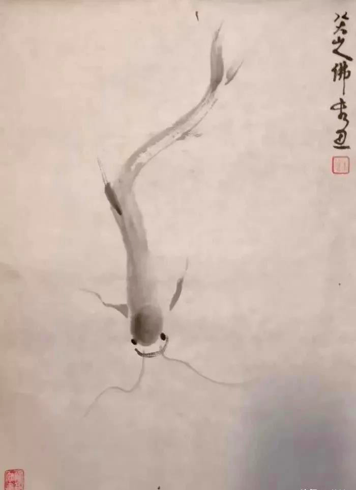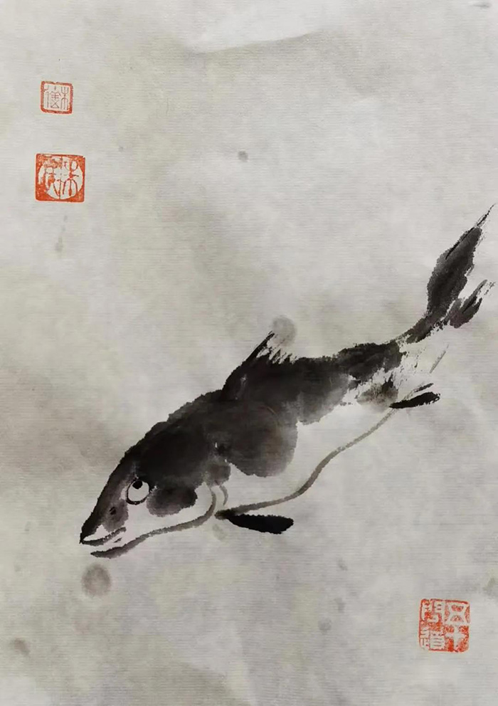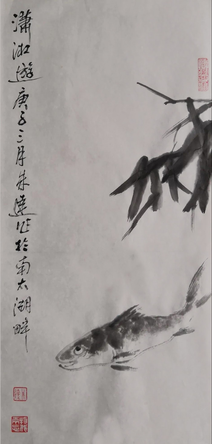 朱逹笔下的鱼,多为最普通的鳙鱼、鲶鱼和鲤鱼。它们或在一片白纸的虚空中游动,或嬉戏于莲间叶,造型简练,笔墨浑然通透,意境朴实生动。与八大山人相同的是,朱逹同样借助鱼来抒写自己的心声,表达追求精神自由实现自身灵魂与精神上的双重释放。不同的是,八大山人画中的鱼多以白眼望着青天,冷冷逼人,有无可名状的孤傲之气,这与他做为亡国遗民心怀家仇国恨的经历有关,也承载他一生悲愤、孤凄以及无处安放的灵魂对命运的白眼。