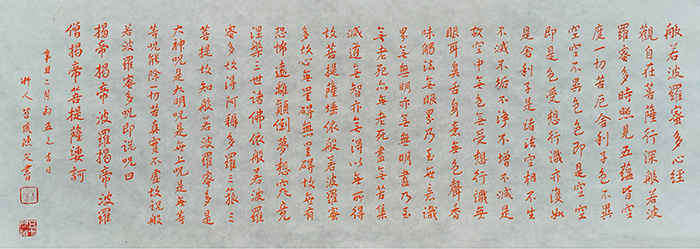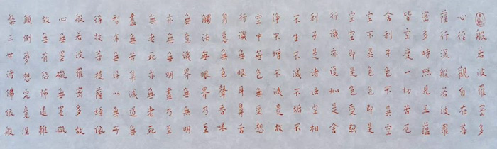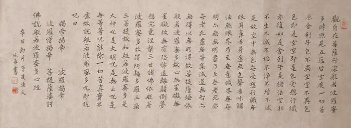 中国画强调“书画同源”、“以书入画”。朱逹常年隐居于碧岩寺,每日以老僧补衲之沉静潜心临习心经,其笔下的书法,先从八大山人与弘一法师两位书僧入手,后合两家于一体,多以抄经的形式呈现。在其作品中并不刻意表现轩昂大气,更不故意着手凌厉锋芒,更注重表现书法的朴拙与真趣。其巧妙地将书法用笔用于绘画之中,通过提、按、顿、挫以及干、湿、浓、淡的变化,让观者在灵动的线条和清新自然的画面中体悟其倾情塑造出来的美学意象。