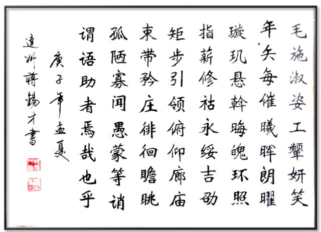 蒋先生擅长欧楷,行书,新魏,篆书,甲骨文,像形字等书体。十分重视基本训练,临遍古今书家名帖,不仅形似,而且神似。