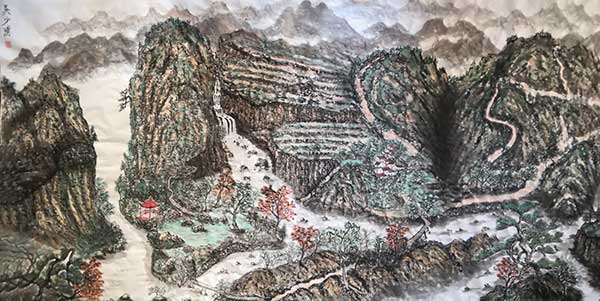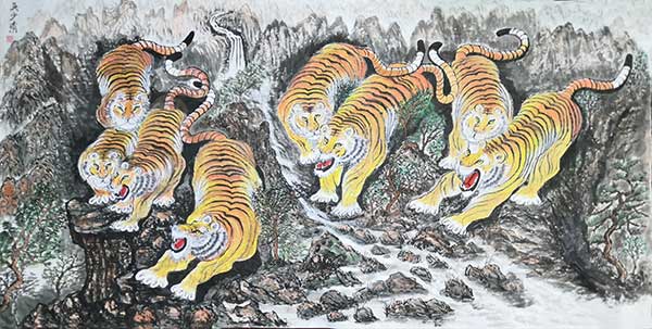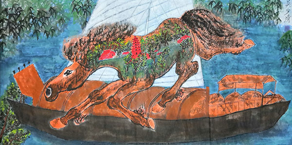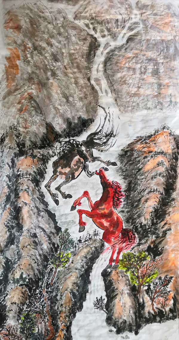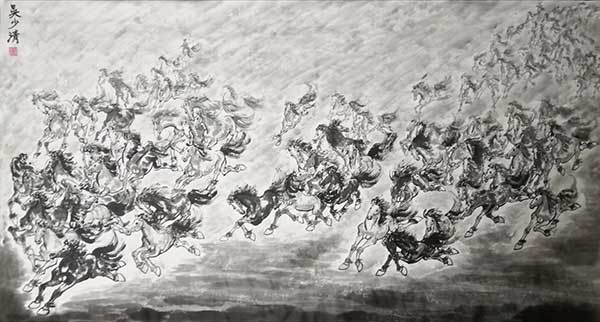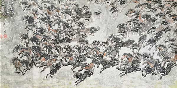 在79米(7900cmx69cm)长卷中,1069匹姿态各异的奔马跃然纸上,所画马匹之多,在国内实属罕见;在另一幅100米奔马图长卷中,则是将所有马匹均大胆采用了红色为主色调,这在绘画史上也是绝无仅有。