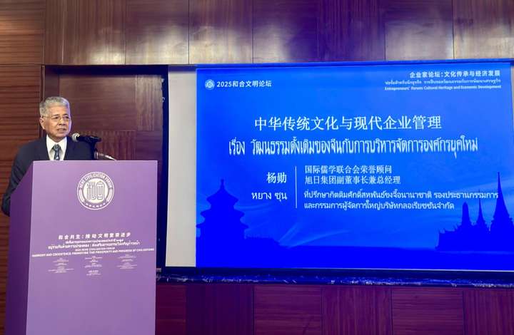 开幕式上,国际儒学联合会会长孙春兰,意大利前总理、欧盟委员会前主席罗马诺·普罗迪,泰国副总理兼国防部长普坦·威乍耶猜,泰国前副总理威萨努·科岩,联合国教科文组织前助理总干事费闵·马多克,中国人民外交学会会长王超,中国驻泰国大使韩志强出席论坛并致辞。日本前首相、国际儒学联合会理事长福田康夫发表书面致辞。国际儒学联合会荣誉顾问、旭日集团有限公司副董事长兼总经理、真维斯国际(中国香港)有限公司董事长杨勋受邀出席活动,并在“文化传承与经济发展”企业家分论坛上发表题为《和合共生 大道同行——以文化传承赋能可持续发展的企业实践》的精彩演讲,分享了他对文化传承与企业发展的深刻见解,以及旭日集团及真维斯在这方面的实践与成果。